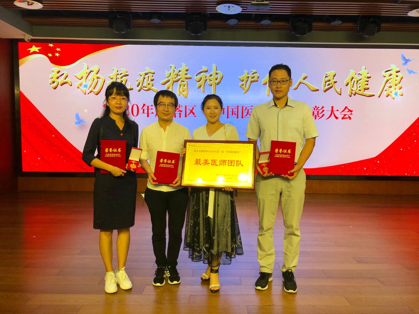 8月19日下午,為隆重慶祝2020年第三屆“中國醫(yī)師節(jié)”,雁塔區(qū)舉辦了以“弘揚(yáng)抗疫精神,護(hù)佑人民健康”為主題的表彰大會。校醫(yī)院門診部丁麗主任和醫(yī)師趙利劍、洪艷萍、姚剛代表校醫(yī)院參加了此次頒獎活動。