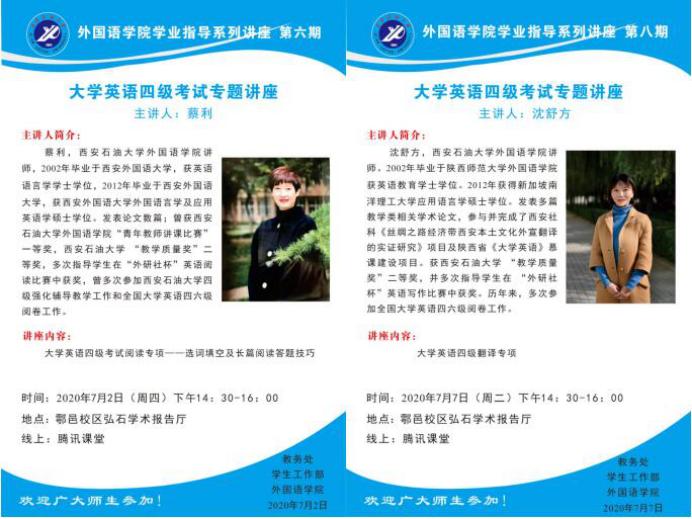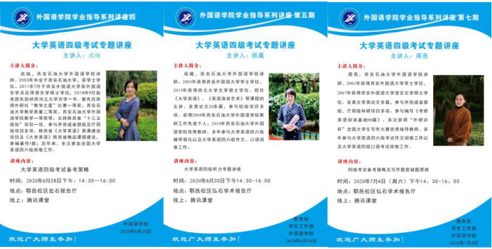 為了讓我學(xué)生全面了解大學(xué)英語(yǔ)四級(jí)考試,提升大學(xué)英語(yǔ)四級(jí)通過(guò)率,在教務(wù)處和學(xué)生工作部的支持下,外國(guó)語(yǔ)學(xué)院6月29日至7月7日分別舉辦五場(chǎng)大學(xué)英語(yǔ)四級(jí)講座。此次講座面向全校學(xué)生,以線上和線下兩種方式進(jìn)行,線下主會(huì)場(chǎng)設(shè)在鄠邑校區(qū)弘石學(xué)術(shù)報(bào)告廳,分會(huì)場(chǎng)設(shè)在各四級(jí)強(qiáng)化輔導(dǎo)班教室,線上使用騰訊課堂直播,截至目前為止我校共有5342名同學(xué)通過(guò)線上線下方式參加了此次系列講座。