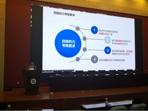 五場(chǎng)四級(jí)講座由外國(guó)語(yǔ)學(xué)院大學(xué)英語(yǔ)四級(jí)教學(xué)研究團(tuán)隊(duì)教師主講,分別為武絨老師主講的“大學(xué)英語(yǔ)四級(jí)考試備考策略”、拓葳老師主講的“大學(xué)英語(yǔ)四級(jí)聽(tīng)力專題”,周亮老師主講的“CET-4考試寫作題型分析及破題思路”,蔡利老師主講的“大學(xué)英語(yǔ)四級(jí)考試選詞填空及長(zhǎng)篇閱讀答題技巧”及沈舒方老師主講的“大學(xué)英語(yǔ)四級(jí)翻譯專項(xiàng)”。主講教師就詞匯記憶、四級(jí)聽(tīng)力與寫作的試題特點(diǎn)與應(yīng)試策略、四級(jí)閱讀的出題特點(diǎn)與應(yīng)試技巧及四級(jí)翻譯的命題特點(diǎn)和答題技巧進(jìn)行了全面而又細(xì)致的講解。