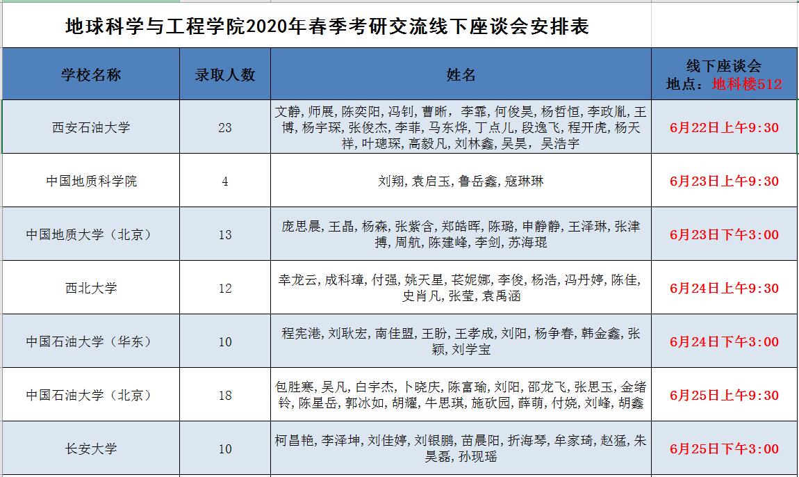 2020年6月22日——25日,地球科學(xué)與工程學(xué)院針對2017級考研學(xué)生,分西安石油大學(xué)、中國地質(zhì)科學(xué)院、中國地質(zhì)大學(xué)(北京)、西北大學(xué)、中國石油大學(xué)(華東)、中國石油大學(xué)(北京)、長安大學(xué)等七所目標(biāo)院校,邀請2016級考研成功的同學(xué)分享經(jīng)驗(yàn),一共舉辦七場考研交流活動。