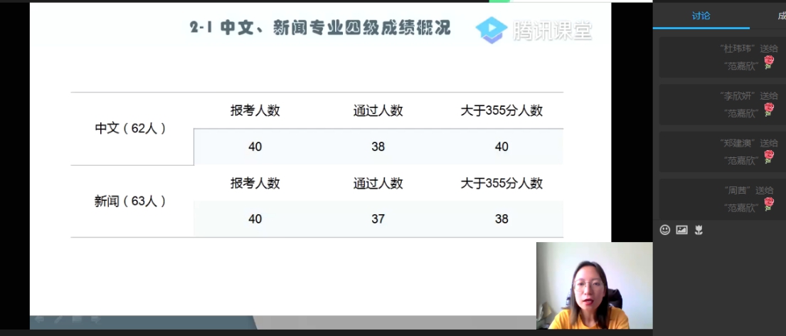 2019級(jí)的年級(jí)大會(huì)首先由盛書記進(jìn)行重要講話。她在期末考試安排、疫情期間的心理健康、英語四級(jí)考試和學(xué)生人生規(guī)劃四個(gè)方面做了指示和強(qiáng)調(diào)。盛書記特別指出,英語四級(jí)成績(jī)?cè)诟麟A段都起著重要作用,督促同學(xué)們抓緊假期時(shí)間備考;她還具體解釋了人生規(guī)劃中需要考慮的四象限因素,期望同學(xué)們以更加科學(xué)的方式進(jìn)行準(zhǔn)確的人生規(guī)劃。隨后,張老師從大一學(xué)年總結(jié)、大二要求、目標(biāo)教育方面向同學(xué)們作了細(xì)致講解。張老師展示了大一課外活動(dòng)剪影,分析了各專業(yè)班級(jí)學(xué)科通過率,分享了四級(jí)成績(jī)高分榜、宿舍內(nèi)務(wù)評(píng)比情況,并對(duì)曠課處罰、考試紀(jì)律、推免研究生及學(xué)位授予條件等進(jìn)行了細(xì)致說明,希望同學(xué)們?cè)谧袷貙W(xué)校紀(jì)律的情況下,積極進(jìn)取,認(rèn)真學(xué)習(xí),爭(zhēng)做本專業(yè)的佼佼者,享受大學(xué)時(shí)光