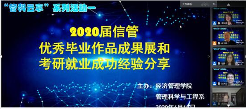 為了豐富“停課不停學(xué)”的線上教學(xué)活動,2020年6月15日下午14:30,經(jīng)濟(jì)管理學(xué)院管理科學(xué)與工程系信息管理與信息系統(tǒng)專業(yè)利用騰訊會議開展了一次師生共享的成果交流會。參會人員不僅包括學(xué)院的老師、在讀本科生,還特別邀請了已經(jīng)畢業(yè)的學(xué)生分享成功經(jīng)驗(yàn),參會人數(shù)達(dá)200多人。