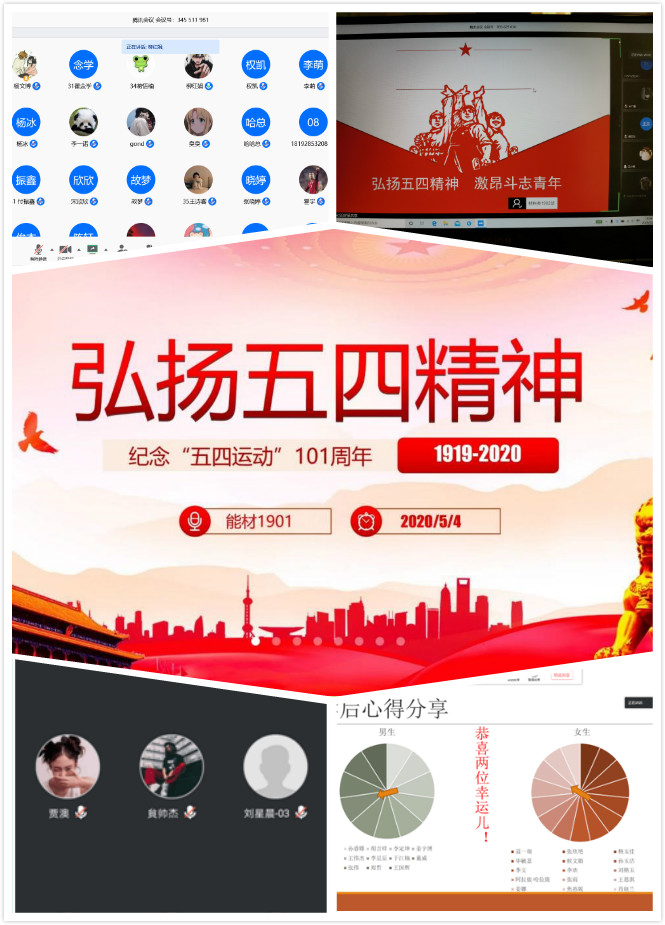 為紀(jì)念五四運(yùn)動(dòng)101周年,進(jìn)一步引導(dǎo)廣大青年團(tuán)員繼承和發(fā)揚(yáng)五四精神,展現(xiàn)當(dāng)代青年風(fēng)采。20205月,材料科學(xué)與工程學(xué)院各班、團(tuán)支部召開了以“傳承五四精神,弘揚(yáng)愛國(guó)情懷”、“青春向黨、歌頌五四”等為主題的線上班團(tuán)會(huì)。此次主題班團(tuán)會(huì)準(zhǔn)備充分,內(nèi)容充實(shí),形式多樣。通過線上學(xué)習(xí)習(xí)近平總書記五四寄語(yǔ)和優(yōu)秀青年事跡、唱團(tuán)歌、經(jīng)典誦讀、知識(shí)競(jìng)答、觀看五四精神紀(jì)錄片等方式,號(hào)召?gòu)V大團(tuán)員不忘入團(tuán)初心、牢記團(tuán)員使命,以實(shí)際行動(dòng)傳承五四精神、弘揚(yáng)愛國(guó)情懷。
