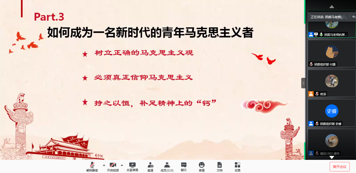 馬琦老師首先簡(jiǎn)要介紹了青馬工程的核心思想,闡述了青馬工程的培養(yǎng)對(duì)象、培養(yǎng)目標(biāo)以及工程解析,強(qiáng)調(diào)了青馬工程是堅(jiān)持用馬克思主義中國(guó)化的最新成果武裝青年,著力培養(yǎng)有理想、有追求,有擔(dān)當(dāng)、有作為,有品質(zhì)、有修養(yǎng)的大學(xué)生,是高校人才培養(yǎng)模式的有益補(bǔ)充,有助于錘煉青年的思想道德意志,促進(jìn)青年的全面發(fā)展成長(zhǎng),幫助大學(xué)生學(xué)習(xí)和掌握黨的理論創(chuàng)新成果,了解國(guó)情,認(rèn)識(shí)社會(huì),提高思想政治素質(zhì),堅(jiān)定理想信念。緊接著,馬老師講述了青年馬克思主義者的定義以及培養(yǎng)青年馬克思主義者的必要性,他指出青年大學(xué)生加入青馬工程的隊(duì)伍不是最終目的,最重要的是要通過(guò)“青馬工程”的培養(yǎng)獲得自我提升,成長(zhǎng)為優(yōu)秀的青年馬克思主義者,新時(shí)代的青年學(xué)生要樹立正確的馬克思主義觀,明確正確的前進(jìn)方向,加強(qiáng)對(duì)黨史、革命史和改革開放的深入學(xué)習(xí)理解,了解國(guó)家發(fā)展歷程,學(xué)習(xí)馬克思主義中國(guó)化的最新成果,自覺(jué)走與實(shí)踐結(jié)合,與人民群眾結(jié)合的道路,沿著這條道路奮斗發(fā)展。最后,通過(guò)具體事例的串講,馬老師鼓勵(lì)同學(xué)們要持之以恒,培養(yǎng)做好新一代青年馬克思主義接班人的主人翁意識(shí),肩負(fù)時(shí)代使命,不忘初心,砥礪前行。