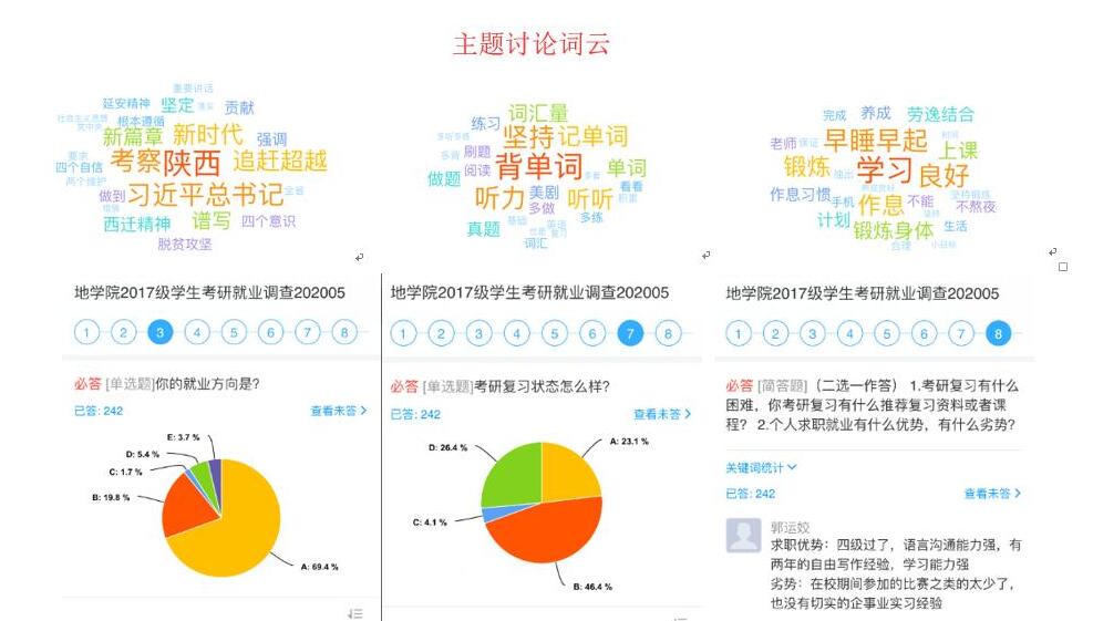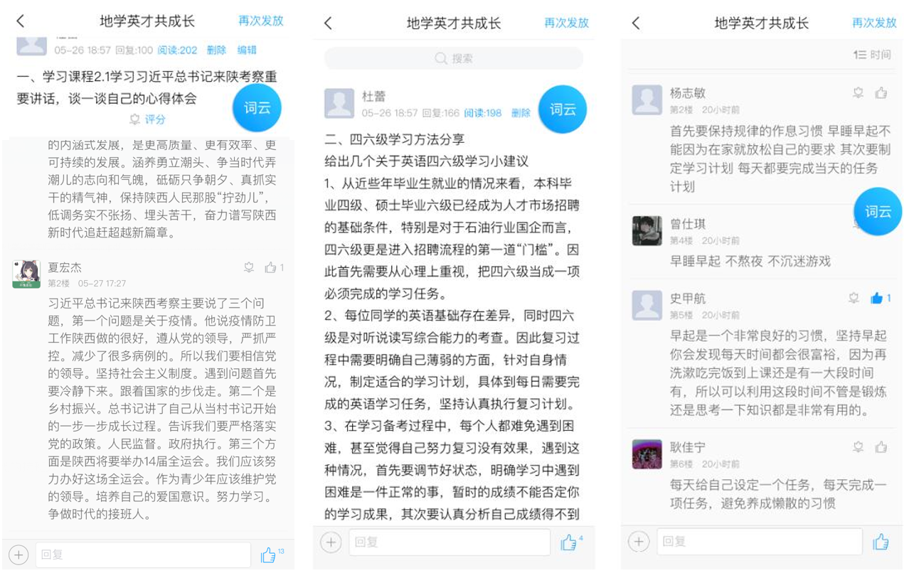 學(xué)院學(xué)工辦在超星學(xué)習(xí)通平臺建立“地學(xué)英才共成長”課程門戶。首先,各年級學(xué)生共同學(xué)習(xí)了習(xí)近平總書記來陜考察重要講話,并在主題討論模塊發(fā)表學(xué)習(xí)心得。隨后,學(xué)工辦老師針對不同年級發(fā)布主題討論話題。2019級學(xué)生專題討論:“居家網(wǎng)課期間,少了老師的引導(dǎo)和同學(xué)的陪伴,你是怎樣進(jìn)行自我管理的,關(guān)于學(xué)習(xí)習(xí)慣的養(yǎng)成你又有什么好的方法?”2018級學(xué)生專題學(xué)習(xí)輔導(dǎo)員老師撰寫的英語四六級學(xué)習(xí)經(jīng)驗分享網(wǎng)文,并跟帖分享自己英語學(xué)習(xí)的好方法。2017級學(xué)生填寫就業(yè)考研意向的調(diào)查問卷。各年級學(xué)生在APP內(nèi)跟帖發(fā)言,互動效果良好。