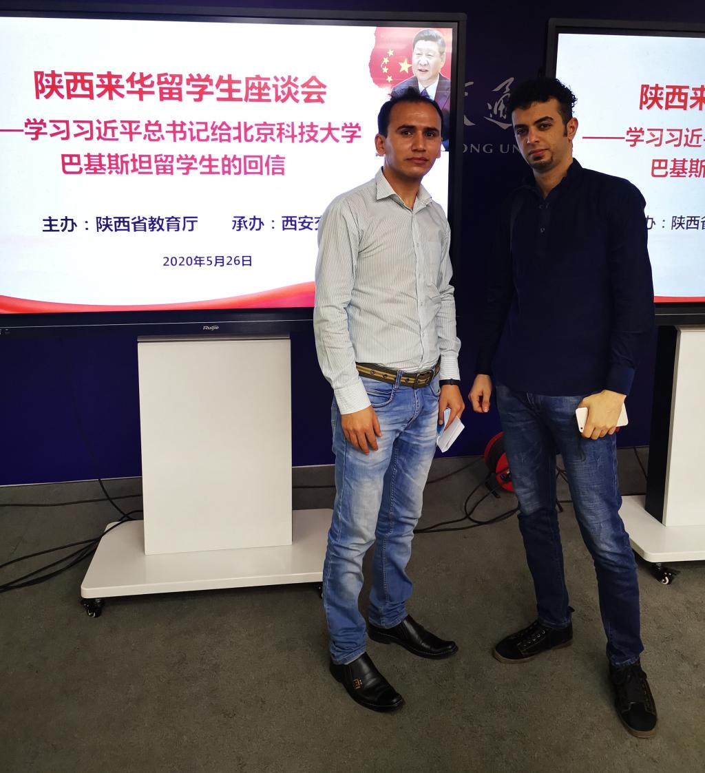5月26日,陜西來華留學(xué)生學(xué)習(xí)習(xí)近平總書記給北京科技大學(xué)巴基斯坦留學(xué)生的回信座談會在西安交通大學(xué)興慶校區(qū)科學(xué)館舉行,24名分別來自西安石油大學(xué)、西安交通大學(xué)、西北工業(yè)大學(xué)等12所高校的來華留學(xué)生代表參加本次座談,就習(xí)近平總書記給北京科技大學(xué)巴基斯坦留學(xué)生的回信發(fā)言,分享學(xué)習(xí)體會。巴基斯坦籍碩士研究生穆塔西及也門籍碩士研究生阿單作為我校學(xué)生代表進(jìn)行了發(fā)言。