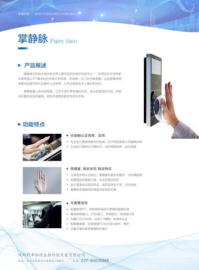陜西利豐恒信生物科技發(fā)展有限公司成立于2017年,是西北地區(qū)最早擁有掌靜脈識別技術(shù),并成功推廣到行業(yè)應(yīng)用的科技創(chuàng)新型單位。公司地址位于西安市高新區(qū),擁有包括掌靜脈識別、指靜脈識別、人臉識別、指紋識別等國內(nèi)外先進的識別專業(yè)技術(shù)。公司致力于先進的生物識別技術(shù)的集成、開發(fā)和應(yīng)用,為不同行業(yè)不同需求的客戶提供整體解決方案,尤其在司法公安系統(tǒng)中結(jié)合實際管理情況和應(yīng)用需求,不斷完善、創(chuàng)新推出具體可行的解決方案,得到各合作單位的一致好評。目前公司業(yè)務(wù)遍及陜西、四川、廣東、海南、廣西等省市。