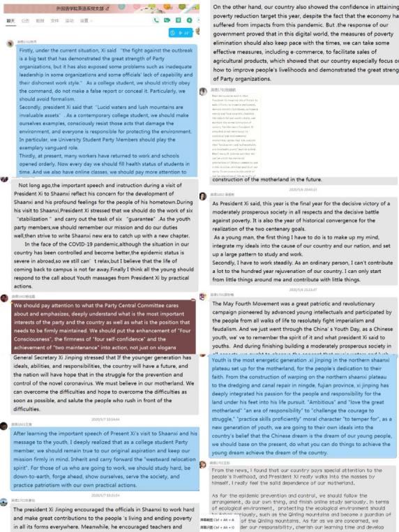 2017級(jí)黨員齊澤芃說:“President Xi  came to Shaanxi province to instruct officials to overcome the impact of the novel corona virus outbreak and fulfill this year's poverty eradication goal during an inspection tour, actually I have lots of words and feelings after what China and the world have gone through or have been going through until now, I really think we Chinese people are the most disciplined nation in the world, which helped us overcome the epidemic quickly. Compared to other countries, we can see they are still in a complete mess, and many countries turn to China.