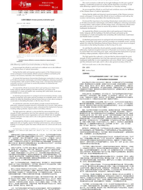 專題學(xué)習(xí)會(huì)上,通過原文學(xué)習(xí)新華社《習(xí)近平在陜西考察時(shí)強(qiáng)調(diào) 扎實(shí)做好“六穩(wěn)”工作落實(shí)“六保”任務(wù) 奮力譜寫陜西新時(shí)代追趕超越新篇章》,認(rèn)真學(xué)習(xí)習(xí)近平總書記來陜考察重要講話重要指示精神,深刻學(xué)習(xí)領(lǐng)會(huì)習(xí)近平總書記關(guān)于新冠肺炎疫情常態(tài)化防控工作的重要講話和指示精神。通過《China Daily》頭條播報(bào)中《Xi stresses poverty eradication goal》一文和習(xí)近平總書記五四青年節(jié)對廣大青年的寄語雙語學(xué)習(xí)資料內(nèi)容進(jìn)行重點(diǎn)學(xué)習(xí),張帆老師還對習(xí)近平總書記來陜視察講話重要指示精神中的重點(diǎn)部分進(jìn)行中英對照講解。