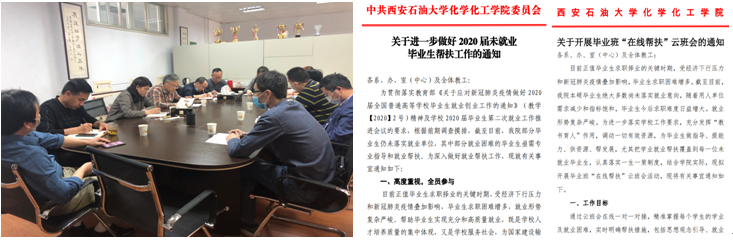 為進(jìn)一步做好畢業(yè)生就業(yè)工作,積極應(yīng)對(duì)疫情期間空中求職、網(wǎng)絡(luò)就業(yè)的新形勢(shì)新挑戰(zhàn),積極開拓畢業(yè)生就業(yè)市場(chǎng),全面提高畢業(yè)生就業(yè)質(zhì)量,真正做到“拔高擴(kuò)中兜底,靶向分類施策,實(shí)現(xiàn)共同就業(yè)”,在學(xué)校黨委部署和就業(yè)指導(dǎo)中心的指導(dǎo)下,化學(xué)與化工學(xué)院黨委高度重視,主動(dòng)部署落實(shí),院內(nèi)聯(lián)動(dòng)協(xié)作,搭建線上平臺(tái),多措并舉推進(jìn),扎實(shí)開展2020屆畢業(yè)生就業(yè)幫扶工作。