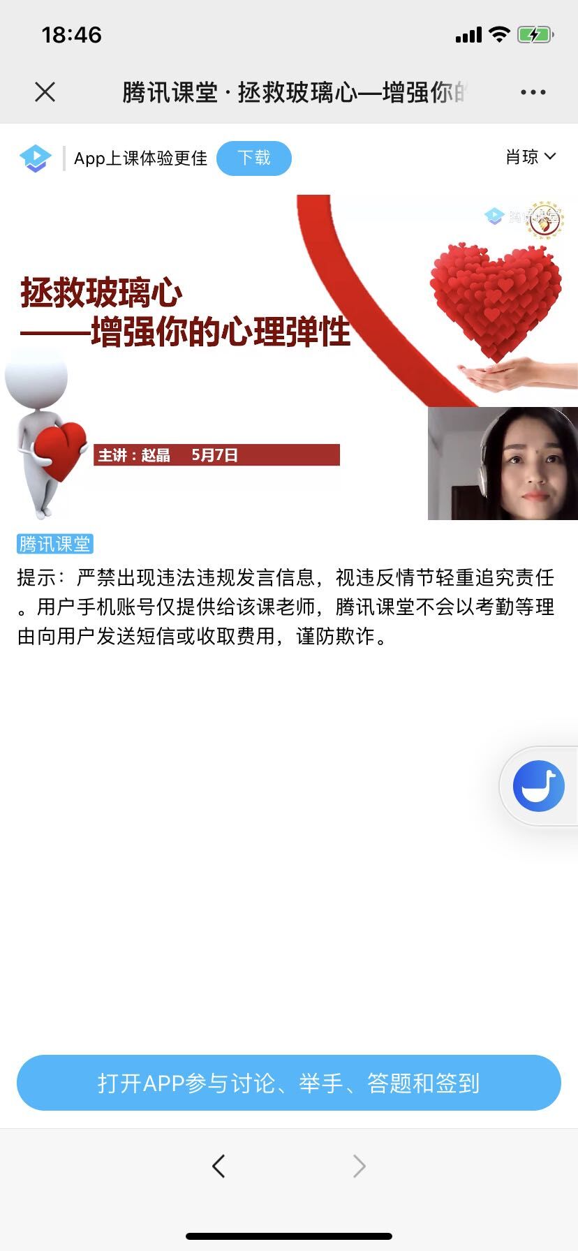 5月7日晚,學(xué)生心理成長指導(dǎo)中心教師趙晶老師在騰訊課堂做了《拯救玻璃心——增強你的心理彈性》專題講座,這是“危機中成長—‘后新冠’時期心理健康教育”系列講座第四講,我校部分教師、后勤樓管、研究生、留學(xué)生及全校心理委員近700人在線觀看學(xué)習(xí)。