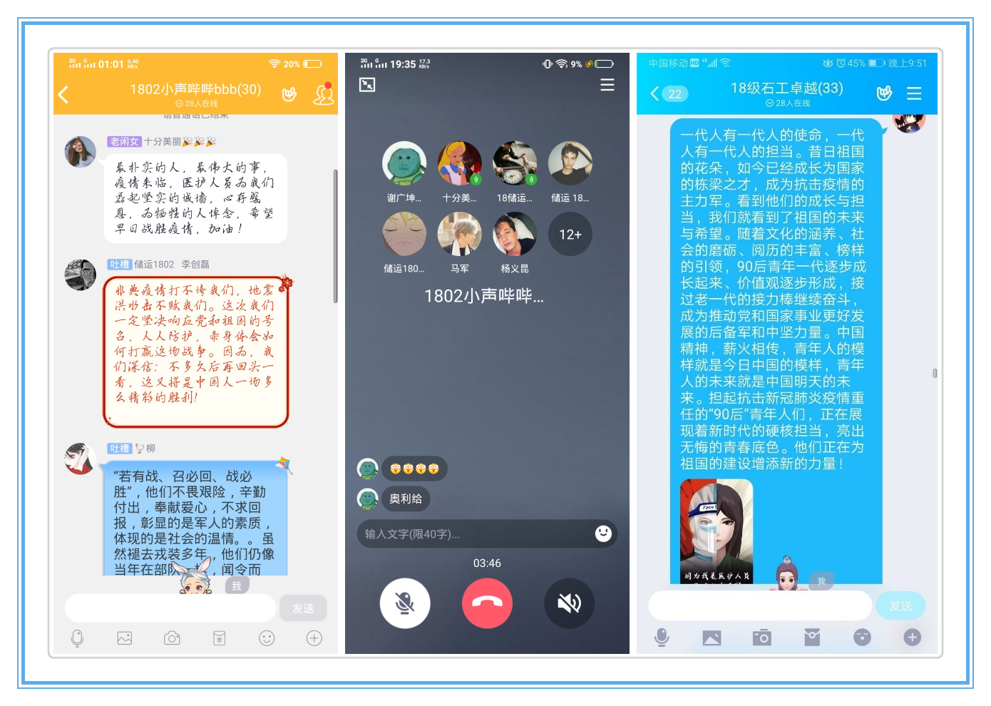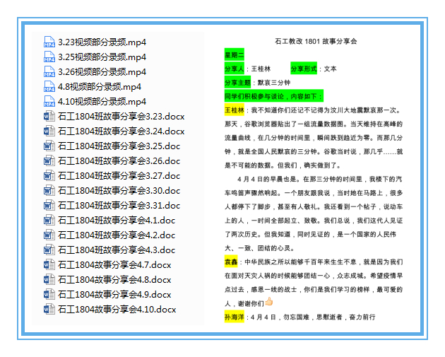 期間,各班級(jí)利用視頻分享或講述故事等形式在線(xiàn)上開(kāi)展故事分享會(huì)96期,分享先鋒故事124個(gè),分享的先鋒故事有按下暫停鍵,封一座城,護(hù)一國(guó)人,識(shí)大體、顧大局的武漢人民;有白衣執(zhí)甲,逆行出征,與死神斗爭(zhēng)的白衣天使;有聞令即動(dòng),勇挑重?fù)?dān),敢打硬仗的人民軍隊(duì);有夜以繼日,奮戰(zhàn)在尋常巷陌,守護(hù)著人民家園的社區(qū)工作者;有不辱使命,日夜奮戰(zhàn),將崗位安在疫情前線(xiàn)的人民警察;有奔走在大街小巷、田間地頭,牢守疫情最后一公里的基層干部;有奔赴不同崗位,真誠(chéng)奉獻(xiàn),匯聚抗疫強(qiáng)大力量的志愿者;更有用行動(dòng)彰顯大國(guó)氣魄與風(fēng)范,打贏抗疫大考,為國(guó)際社會(huì)貢獻(xiàn)抗疫智慧、輸送抗疫物資的中國(guó)政府。
