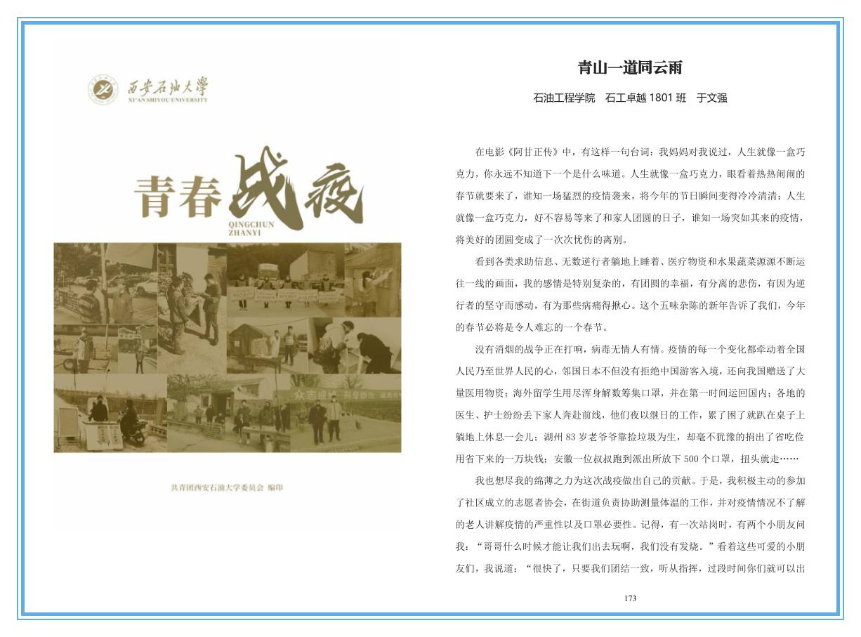 為弘揚(yáng)抗疫英雄的優(yōu)秀品格,感悟中國(guó)的大國(guó)責(zé)任與擔(dān)當(dāng),激發(fā)廣大學(xué)生的愛(ài)國(guó)情懷,323-416日,石油工程學(xué)院2018級(jí)各班級(jí)開(kāi)展了“抗疫先鋒故事”分享會(huì)。
