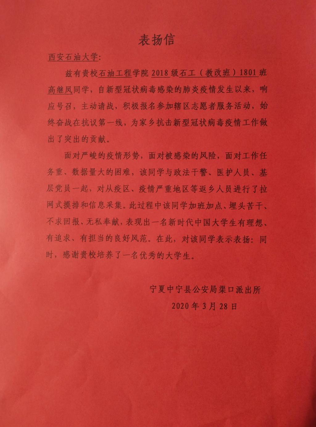 新冠肺炎疫情發(fā)生以來,石油工程學(xué)院青年學(xué)子勇挑重擔、主動出擊,參與到家鄉(xiāng)社區(qū)、鄉(xiāng)村的各項防控工作中。328日,學(xué)院2018級學(xué)生高繼鳳同學(xué),因在疫情防控工作中表現(xiàn)突出,受到了寧夏中寧縣公安局渠口派出所的表揚。