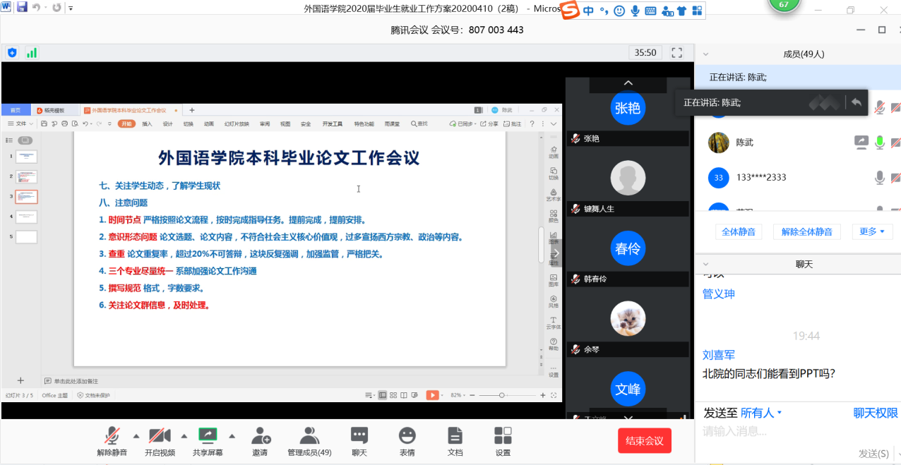 為了進一步做好學院2020屆畢業(yè)生畢業(yè)論文和就業(yè)指導工作,外國語學院4月16日晚采用騰訊會議方式召開了學院2020屆畢業(yè)生畢業(yè)論文暨就業(yè)工作推進會。學院黨政領(lǐng)導、各系主管論文工作的主任、綜合辦公室主任、學生管理辦公室主任、專兼職輔導員、教學秘書,全體研究生、本科生論文指導老師共50余人參加會議。會議由學院黨委書記蔡強主持。