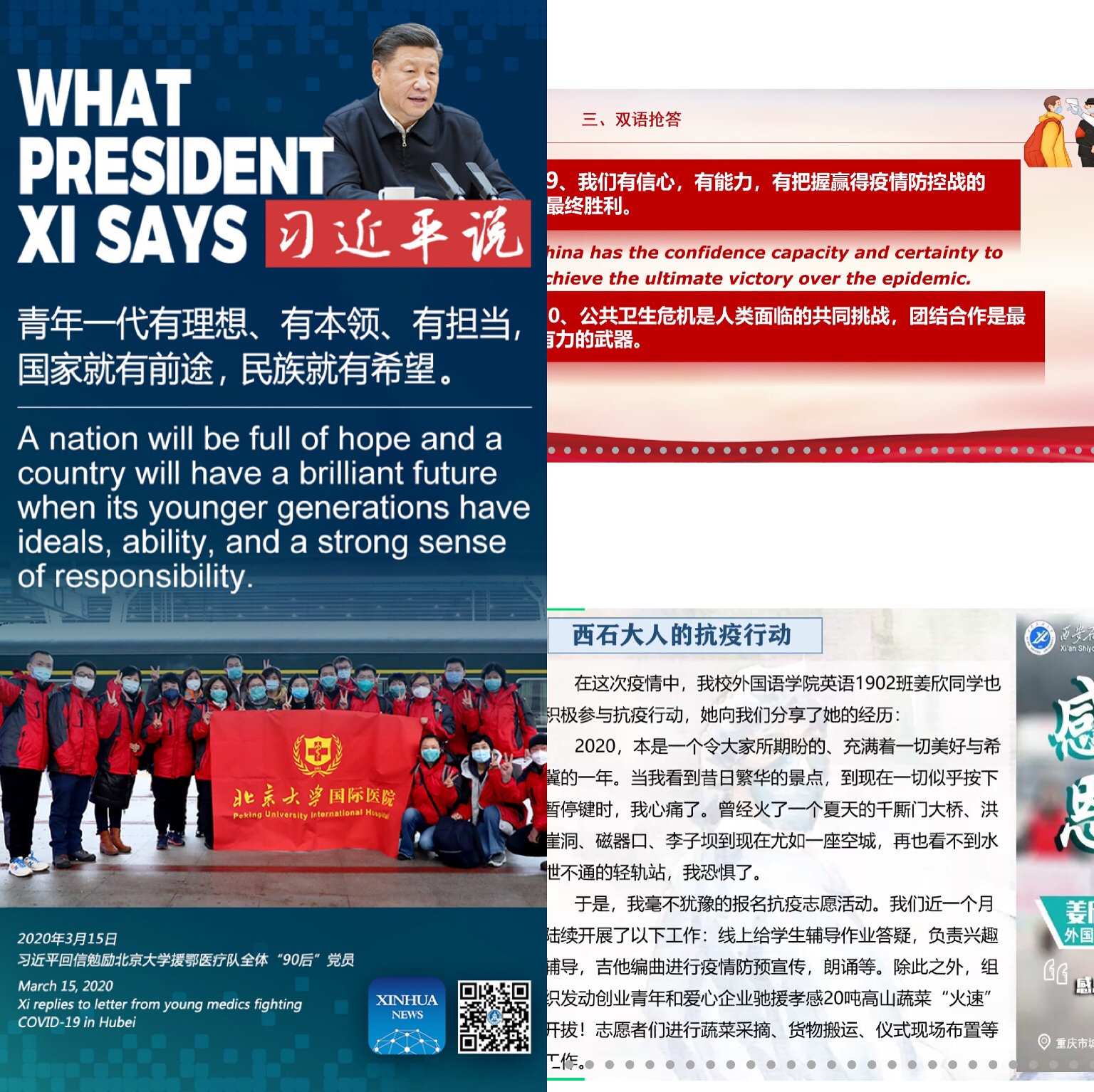 主題學(xué)習(xí)過程中,同學(xué)們根據(jù)對(duì)疫情期間全國人民在黨中央的領(lǐng)導(dǎo)下,白衣天使、公安干警和人民軍隊(duì)奮不顧身,舍小家為大家的大無畏精神以及以西藏大學(xué)醫(yī)學(xué)院學(xué)生、北京大學(xué)援鄂醫(yī)療隊(duì)全體“90黨員的朋輩先鋒模范擔(dān)當(dāng)時(shí)代使命的英勇表現(xiàn)的所見所感,結(jié)合自己認(rèn)真學(xué)習(xí)習(xí)近平總書記的回信原文的學(xué)習(xí)心得,用自己所學(xué)的專業(yè)表達(dá)了西安石油大學(xué)外國語學(xué)院青年學(xué)生的心聲,用中英雙語在活動(dòng)中展開了熱烈的學(xué)習(xí)心得交流,既加深了同學(xué)們對(duì)習(xí)近平總書記對(duì)廣大青年學(xué)生的勉勵(lì)和鼓勵(lì)的理解,又在活動(dòng)了加強(qiáng)了專業(yè)知識(shí)理論學(xué)習(xí)。