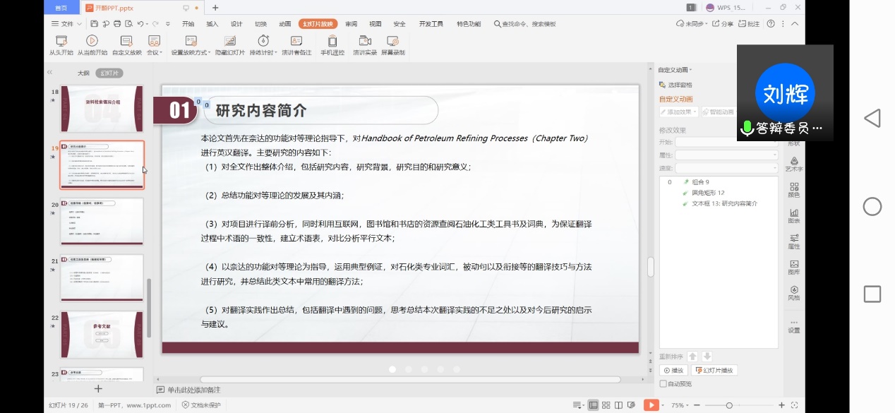 研究生學(xué)位論文開題是完成學(xué)位論文工作的基礎(chǔ),是保證學(xué)位論文質(zhì)量的重要環(huán)節(jié),為保證研究生培養(yǎng)質(zhì)量研究生學(xué)位論文水平,外國語學(xué)院依據(jù)研究生院《碩士學(xué)位論文開題管理補(bǔ)充規(guī)定》制定了2018級(jí)翻譯碩士研究生二次開題工作細(xì)則,并于43日上午,使用線上平臺(tái)(騰訊會(huì)議)進(jìn)行了2018級(jí)翻譯碩士研究生二次開題答辯會(huì)。答辯小組包括組長(zhǎng)袁森教授,答辯委員劉輝教授和秦艷霞副教授,共有9名翻譯碩士研究生參加答辯。