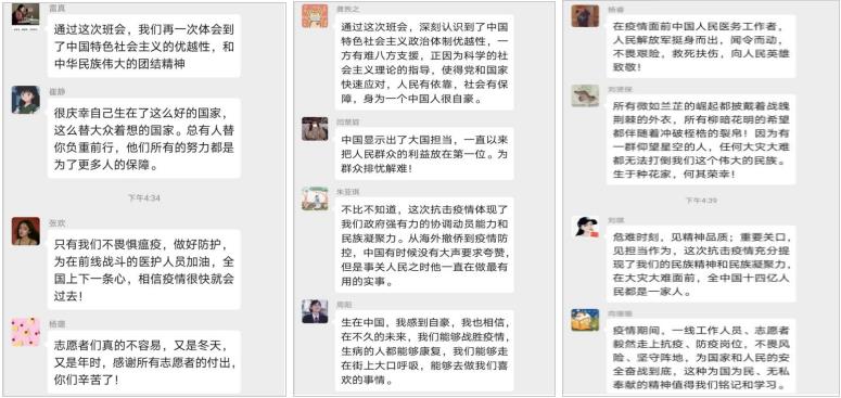 最后,趙劍波老師總結(jié)本次“云”班會,講解新冠肺炎疫情下體現(xiàn)出中國特色社會主義制度的優(yōu)越性。中國共產(chǎn)黨領導中華民族在社會主義制度下從戰(zhàn)亂中萌發(fā)壯大,具有中國特色的社會主義管理制度使得中國人民開始卓立潮頭,社會主義制度的巨大優(yōu)勢就是能夠集中力量辦大事,這在新中國成立70年、改革開放40年來的實踐和遭遇重大事件中反復得到印證,所以我們堅信我們的國家一定有能力取得疫情防控阻擊戰(zhàn)的最終勝利!