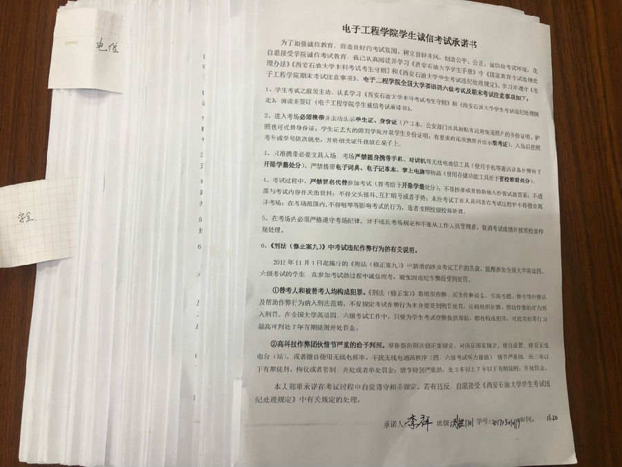 系列活動(dòng)之簽署誠信考試承諾書。為進(jìn)一步加強(qiáng)學(xué)生誠信意識(shí),將誠信考試落到實(shí)處,確保將考試相關(guān)紀(jì)律要求傳達(dá)給每一名同學(xué),堅(jiān)決抵制作弊行為,各班級(jí)印制承諾書,組織各班級(jí)同學(xué)簽署誠信考試承諾書,要求同學(xué)們謹(jǐn)記承諾內(nèi)容,克服僥幸心理,自覺抵制作弊行為,力求達(dá)到教育廣大學(xué)生誠信考試的目的,激發(fā)學(xué)生學(xué)習(xí)動(dòng)力。