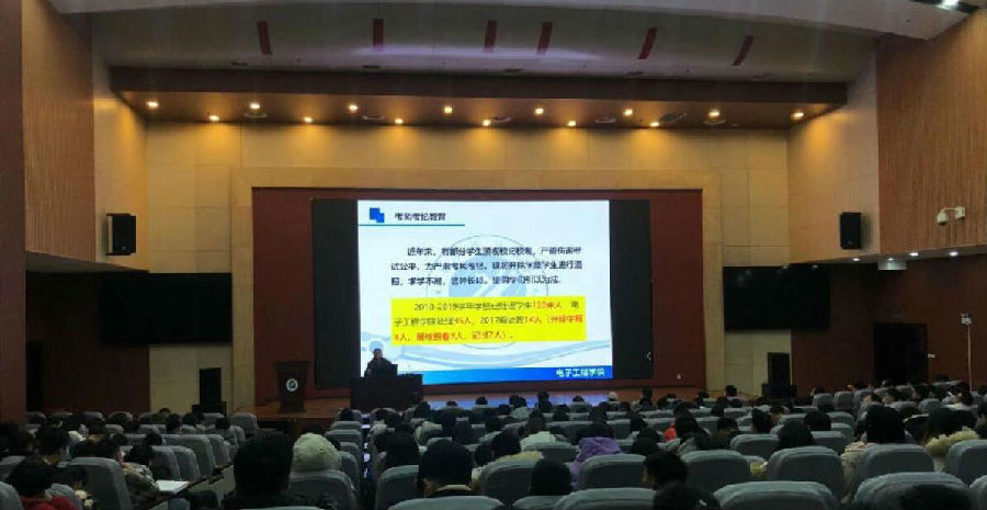 系列活動(dòng)之召開學(xué)風(fēng)考風(fēng)推進(jìn)會(huì)議。電子工程學(xué)院2017級(jí)輔導(dǎo)員高建邦分專業(yè)對(duì)學(xué)院2017級(jí)學(xué)生召開學(xué)風(fēng)考風(fēng)推進(jìn)會(huì)議。高建邦老師首先對(duì)學(xué)生進(jìn)行誠信教育,提高大學(xué)生的誠信應(yīng)考意識(shí),引導(dǎo)青年學(xué)生牢固樹立守信光榮、失信可恥的道德觀念。隨后,高老師對(duì)考試紀(jì)律規(guī)定,違紀(jì)處分管理規(guī)定等方面做了詳細(xì)介紹,并通報(bào)了近年來因作弊處分的學(xué)生情況,讓同學(xué)們深刻認(rèn)識(shí)到違反制度對(duì)自身發(fā)展的影響。