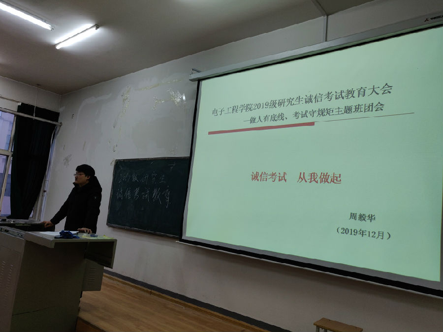 為進一步增強研究生誠信考試意識,扎實推進研究生誠信考試教育及學風提升工作,12月25日下午,電子工程學院在鄠邑校區(qū)C3實驗樓419教室舉行研究生誠信考試教育大會,學生管理辦公室主任周毅華老師主持會議,2019級全體研究生參加會議。