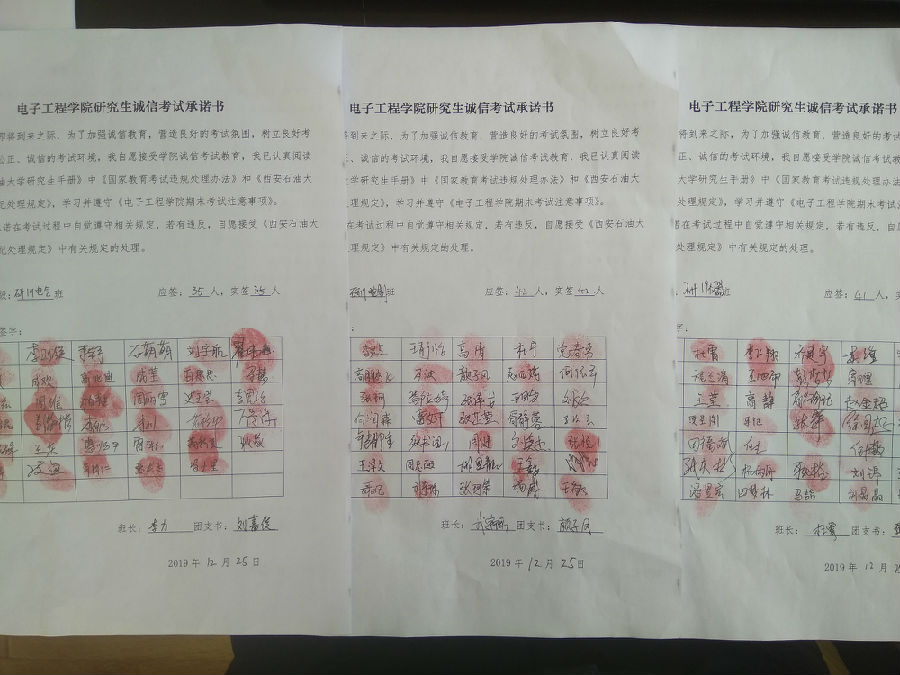 最后,周老師帶領同學們學習了《電子工程學院期末考試注意事項》,全體2019級研究生現場簽署了《電子工程學院研究生誠信考試承諾書》并鄭重按下個人手印。同學們表示,在日后學習生活中將牢記學校 “兩個紅線”教育,誠信考試、本分做人,用勤奮踏實的作風譜寫人生華章,用真才實學報效國家,回報社會。