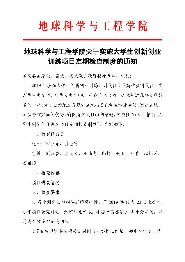 同時,為落實“以本為本”的育人宗旨,深入挖掘雙創(chuàng)項目育人功能,本學(xué)期學(xué)院成立了由主管教學(xué)的副院長、主管學(xué)生工作的副書記為組長,專業(yè)老師、雙創(chuàng)專干為組員的工作領(lǐng)導(dǎo)小組,制定了《地球科學(xué)與工程學(xué)院關(guān)于實施大學(xué)生創(chuàng)新創(chuàng)業(yè)訓(xùn)練項目定期檢查制度的通知》文件,從人員和組織制度上有效保證了我院雙創(chuàng)訓(xùn)練項目規(guī)范化運(yùn)行。