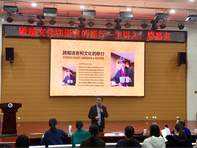 2019年11月26日下午2:00,人文學(xué)院"學(xué)術(shù)誠信活動月"系列講座暨第13期學(xué)術(shù)沙龍在鄠邑校區(qū)人文經(jīng)管樓118如期舉行。本次講座的主講人廖嘉良博士,他為漢語國際教育專業(yè)研究生做了題為“跨越文化的語言和修行”的精彩演講。講座由黃慶豐副院長主持。