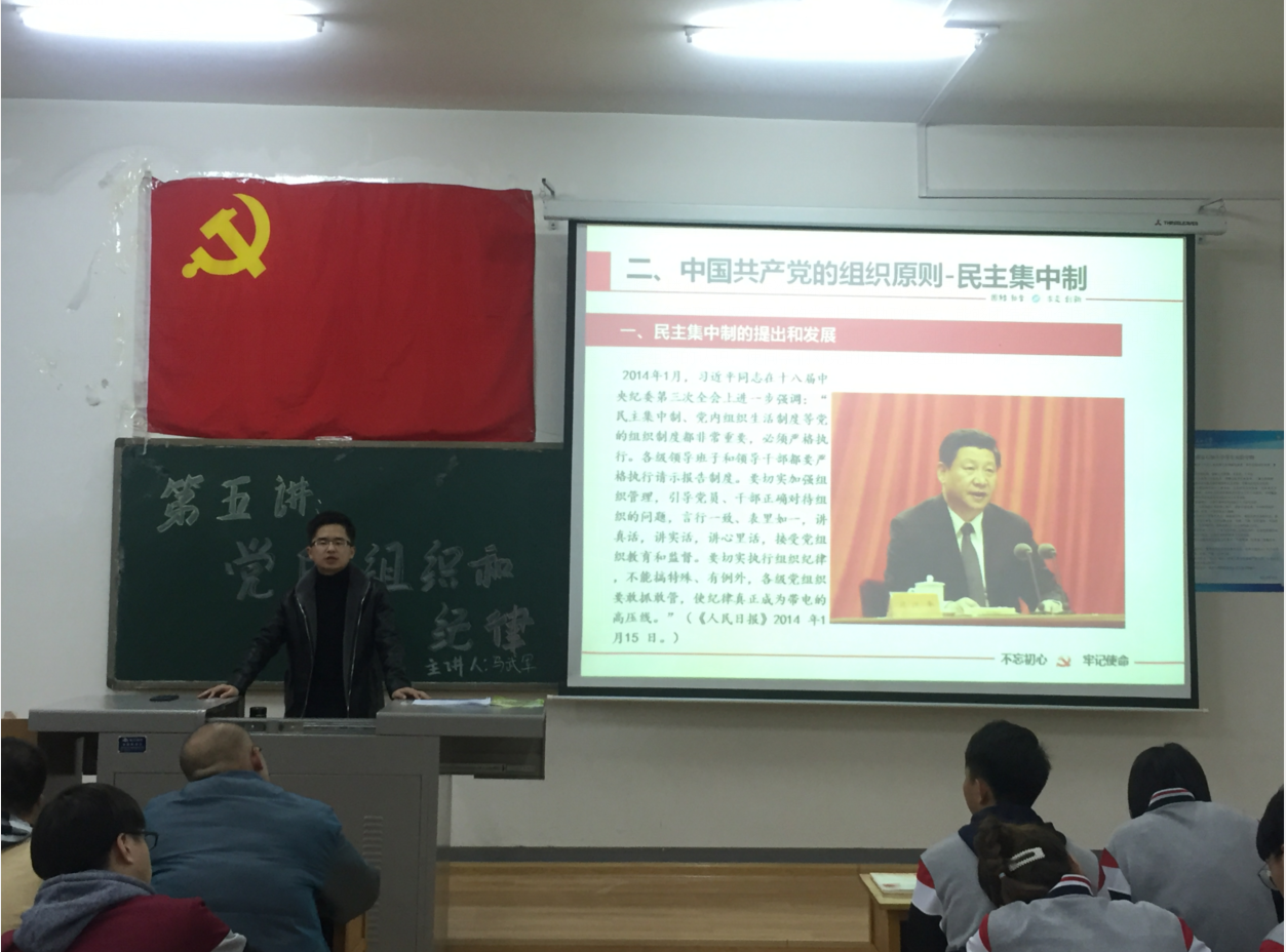 首先,馬武軍老師為大家介紹了中國共產黨之所以從小到大、從弱到強,從一個奪取政權而奮斗的黨到長期執(zhí)政的黨,能夠團結帶領全國各族人民戰(zhàn)勝各種艱難險阻,不斷從勝利走向勝利,一個重要原因就是擁有嚴密的組織、嚴明的紀律和優(yōu)良的作風。隨后,馬老師就“黨的組織體系”、“黨的組織原則-民主集中制”、“黨的紀律內容特點”、“對黨的處分分類、措施和原則五個方面分別進行了詳細介紹,參與本次黨課,同學深刻的了解到中國共產黨的組織、紀錄以及組織原則,加深了對黨組織的認識,使同學們對黨的進行了更全面的了解。通過本次黨課,同學們定會更加深入的學習黨的知識,提高自身的政治素質,為學院和社會的發(fā)展做出貢獻。
