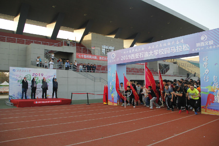 “七十載櫛風(fēng)沐雨、西石大與祖國(guó)共奮進(jìn)”,由體育系承辦的2019西安石油大學(xué)首屆校園馬拉松于11月15日下午16:30在鄠邑校區(qū)東田徑場(chǎng)盛大舉行。校體育運(yùn)動(dòng)委員會(huì)主任、西安石油大學(xué)副校長(zhǎng)陳軍斌、鄠邑校區(qū)管理辦公室主任覃彪、校醫(yī)院院長(zhǎng)崔廣志、保衛(wèi)(部)處、武裝部副處長(zhǎng)張永華、體育系黨總支書記倪振文等領(lǐng)導(dǎo)進(jìn)行了聯(lián)合發(fā)令。