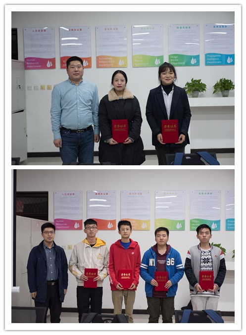 朱戰(zhàn)威老師與張浩然老師共同對(duì)石工院新一屆易班工作站學(xué)生干部頒發(fā)聘書(shū)。