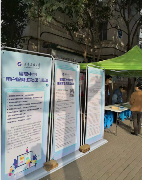 本次活動分別在北院2號青年公寓東側(cè)和南院音樂系樓東側(cè)設(shè)立“服務(wù)站”,通過設(shè)立網(wǎng)絡(luò)知識宣傳展板,發(fā)放宣傳彩頁等方式向教職工和家屬普及網(wǎng)絡(luò)安全知識和校園網(wǎng)使用方法,針對用戶反饋的問題現(xiàn)場逐一解答,根據(jù)用戶需求,黨員和技術(shù)骨干深入教職工家里進(jìn)行上門服務(wù)。