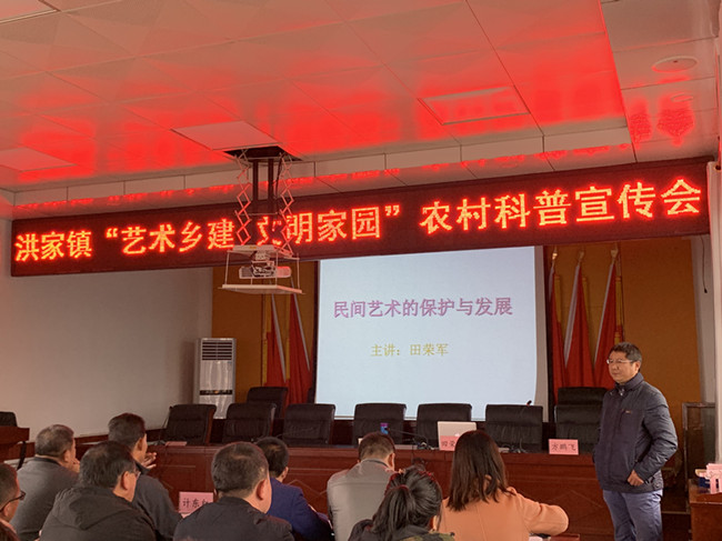 我校人文學院田榮軍博士以“民間藝術(shù)保護與發(fā)展”為主題,通過民間藝術(shù)保護現(xiàn)狀、存在問題、傳承發(fā)展三方面內(nèi)容,用大量生動實例向與會人員作了精彩的講解,為當?shù)厝罕娤到y(tǒng)地梳理了民間藝術(shù)的理論認知,進一步普及了保護和傳承民間藝術(shù),加強鄉(xiāng)村文化提升戰(zhàn)略,開展富有特色的藝術(shù)活動,打造藝術(shù)文化旅游品牌,凝聚鄉(xiāng)村活力,改善農(nóng)民精神風貌,提高鄉(xiāng)村經(jīng)濟文化競爭力等多方面的內(nèi)容。