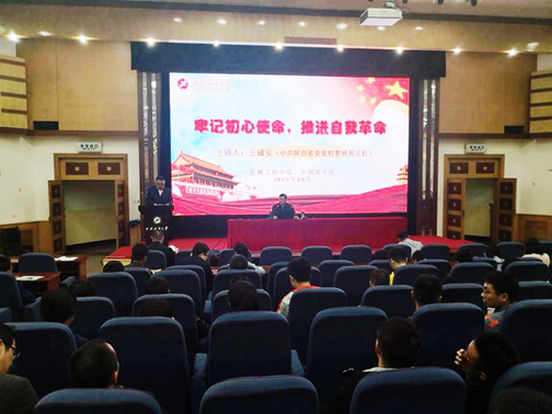 為扎實(shí)開展好“不忘初心、牢記使命”主題教育工作,有效推進(jìn)主題教育工作有序開展,2019年10月17日下午,機(jī)械工程學(xué)院和外國(guó)語學(xué)院聯(lián)合在雁塔校區(qū)學(xué)術(shù)報(bào)告廳舉辦“牢記初心使命、推進(jìn)自我革命”專題學(xué)習(xí)報(bào)告會(huì),特邀知名黨建專家、中共陜西省委黨??粕绮吭魅?,中國(guó)延安干部學(xué)院王誠(chéng)安教授主講,兩個(gè)學(xué)院的教師、研究生200余人參加了學(xué)習(xí)報(bào)告會(huì),機(jī)械工程學(xué)院黨委田黨宏書記主持報(bào)告會(huì)。