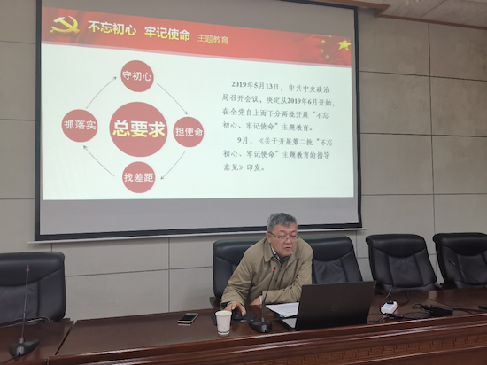 閆書記首先對“不忘初心、牢記使命”主題教育做了簡介。他指出,“不忘初心、牢記使命”主題教育是在全黨范圍內(nèi)開展的主題教育,是推動全黨更加自覺地為實(shí)現(xiàn)新時代黨的歷史使命不懈奮斗的重要內(nèi)容。2019年5月13日, 中共中央政治局召開會議,決定從2019年6月開始,在全黨自上而下分兩批開展“不忘初心、牢記使命”主題教育。9月,《關(guān)于開展第二批“不忘初心、牢記使命”主題教育的指導(dǎo)意見》印發(fā)。本次主題教育的總要求為守初心、擔(dān)使命,找差距、抓落實(shí),根本任務(wù)是牢牢把握深入學(xué)習(xí)貫徹習(xí)近平新時代中國特色社會主義思想、錘煉忠誠干凈擔(dān)當(dāng)?shù)恼纹犯?、團(tuán)結(jié)帶領(lǐng)全國各族人民為實(shí)現(xiàn)偉大夢想共同奮斗,具體目標(biāo)包括理論學(xué)習(xí)有收獲,思想政治受洗禮,干事創(chuàng)業(yè)敢擔(dān)當(dāng),為民服務(wù)解難題,清正廉潔作表率。