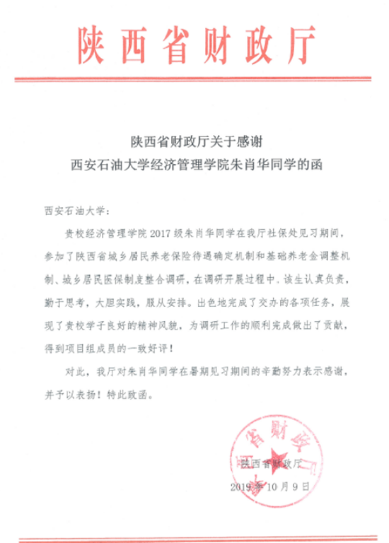 ?近日,陜西省財(cái)政廳向我校經(jīng)濟(jì)管理學(xué)院發(fā)來(lái)感謝函,對(duì)我校2017級(jí)會(huì)計(jì)專業(yè)碩士朱肖華同學(xué)提出表?yè)P(yáng),高度評(píng)價(jià)該同學(xué)在暑期見(jiàn)習(xí)期間的工作表現(xiàn)。