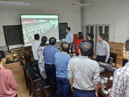 首先大家集中觀看了慶祝中華人民共和國70周年大會,認真聆聽了習近平總書記在慶祝中華人民共和國70周年慶祝大會上的重要講話,懷著激動興奮的心情觀看了閱兵式和群眾游行活動。在集體觀看學習結束后,隨即召開了教師座談會。會上,所有參會教師就自己對新中國發(fā)展歷史、國家的偉大發(fā)展成就等進行了激情洋溢的發(fā)言,展開了熱烈的交流討論,發(fā)表了自己的感想看法。