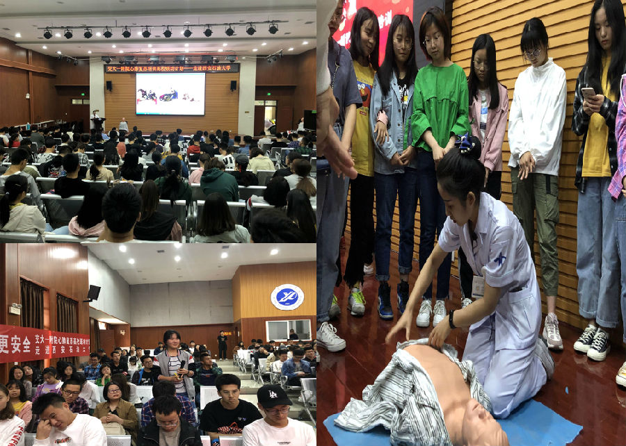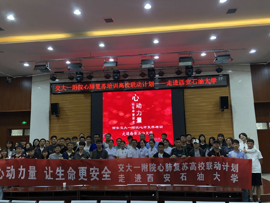 2019年5月29日下午,西安交通大學第一附屬醫(yī)院心肺復蘇培訓高校聯(lián)動計劃第九站走進西安石油大學鄠邑校區(qū)。此次培訓的人員為校醫(yī)院醫(yī)護人員、教職工代表、及學生代表共200余人參加。