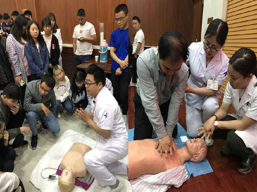 西安交大一附院重癥醫(yī)學科郭秦樂博士,住院醫(yī)師,通過PPT的形式引用生活中的實例,為參加培訓的人員進行急救知識理論培訓,從如何正確判斷病人心跳、呼吸驟停及實施搶救的BLS流程,對搶救的每一個環(huán)節(jié)進行了細致闡述,同時講解了心肺復蘇過程中的注意事項及搶救成功的指標。理論培訓結束后,設立了有獎互動搶答環(huán)節(jié),同學們積極踴躍的參與,加深了對理論知識的記憶?,F(xiàn)場操作培訓分為四組,培訓老師對心肺復蘇呼-叫-C-A-B操作的各個步驟進行演示,并耐心指導每一位同學操作練習,確保每一個急救步驟的正確性。