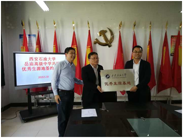 隨著2019年招生工作開始,為了進一步加強招生宣傳,提高我校生源質量。5月10日,電子工程學院、組織部和規(guī)劃處分兩隊走訪了渭南市四所中學:富平縣藍光中學、迤山中學、曹村中學以及華陰縣岳廟高級中學,簽訂了“西安石油大學優(yōu)秀生源基地”合作框架協(xié)議,進行基地掛牌。參與本次活動的有電子工程學院何鋮書記、組織部王亮副部長、規(guī)劃處陳濤副處長、電子工程學院燕并男副院長和高國旺副院長以及部分教師代表。在走訪過程中,與中學校領導、部分老師進行座談,宣傳我校的發(fā)展歷程、重點實驗室、專業(yè)特色、就業(yè)方向、優(yōu)秀校友等方面,發(fā)放我校招生宣傳冊。中學相關人員表示,通過座談,對我校的特色與優(yōu)勢有了進一步的了解,愿意在學生中積極宣傳,鼓勵學生報考我校。