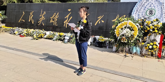 會(huì)計(jì)1603班歐陽(yáng)榕襄作為代表致悼詞。她說到,矗立在大家面前的烈士豐碑,訴說著英雄們光榮而無悔的事業(yè),歲月的風(fēng)塵早已在它身上刻下斑駁的印記,讓大家無法不回想起那段滄桑沉重的往事。七百余位革命烈士長(zhǎng)眠于此。他們?yōu)樽非缶葒?guó)救民的真理拋頭顱,灑熱血;為中華民族的解放事業(yè)前仆后繼,視死如歸。作為新時(shí)代的莘莘學(xué)子,更應(yīng)充滿愛國(guó)之情,樹立報(bào)國(guó)之心,努力學(xué)習(xí),繼承先烈遺志,為家鄉(xiāng)的建設(shè)、為祖國(guó)的富強(qiáng)而努力奮斗。