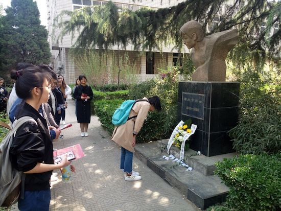 離開烈士陵園后,大家步行至我校雁塔校區(qū),在烈士唐春雨的雕像前,行鞠躬禮,以表達(dá)崇敬和懷念之情。