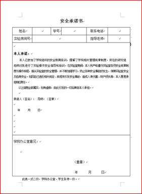 五是簽訂承諾書(shū)。為了增強(qiáng)學(xué)生的實(shí)驗(yàn)安全責(zé)任意識(shí),確保學(xué)生認(rèn)真參加學(xué)院的相關(guān)安全培訓(xùn),約束學(xué)生認(rèn)真規(guī)范實(shí)驗(yàn)操作流程,服從實(shí)驗(yàn)室安全管理規(guī)定,學(xué)院開(kāi)展簽訂承諾活動(dòng),在及時(shí)參與學(xué)習(xí)、參加培訓(xùn),接受指定教師指導(dǎo)的基礎(chǔ)上,每名參與實(shí)驗(yàn)的同學(xué)簽訂安全承諾書(shū),確保實(shí)驗(yàn)安全及學(xué)生人身安全,有效保證了教學(xué)科研的順利進(jìn)行。