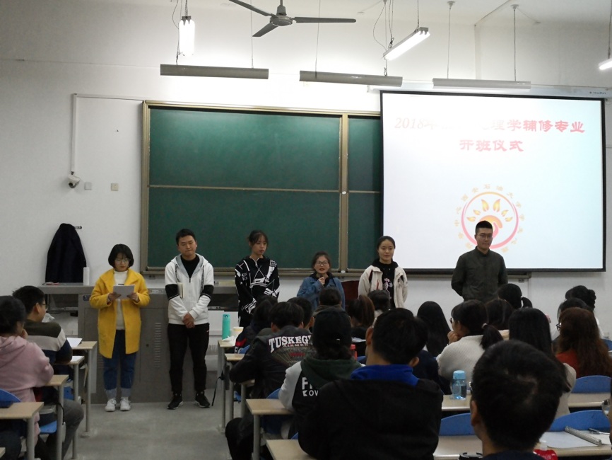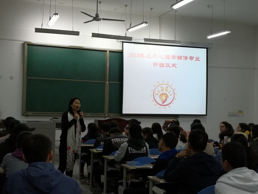 易和平副處長介紹了我校輔修專業(yè)的歷史、發(fā)展、對學校工作的貢獻,結(jié)合親身經(jīng)歷說明了輔修專業(yè)對人的全面發(fā)展的意義,他表態(tài),教務(wù)處會全力支持心理學輔修專業(yè)的建設(shè),最后,他代表學校向全體學生提出了學業(yè)與管理的要求,并預祝大家學業(yè)順利。作為本次輔修專業(yè)的開設(shè)方,肖瓊主任首先感謝學校對2018年應用心理學輔修專業(yè)的大力支持,對課程設(shè)置做了簡短介紹,她提出應用心理學是目前我校唯一在開的輔修專業(yè),是“油緣”心理為學校學科建設(shè)做貢獻的實際行動,勉力同學們合理安排時間,爭取主修專業(yè)與輔修專業(yè)雙贏發(fā)展。,隨后,學生心理成長指導中心的任課教師分別結(jié)合自身成長,從專業(yè)視角、專業(yè)素養(yǎng)、專業(yè)發(fā)展等方面對心理學進行了闡釋。最后,全體班委會成員一一表態(tài)要齊心協(xié)力,為為班級同學做好服務(wù),促進同學們專業(yè)發(fā)展。