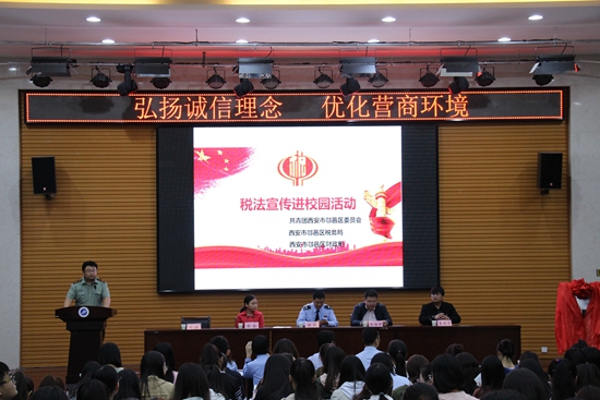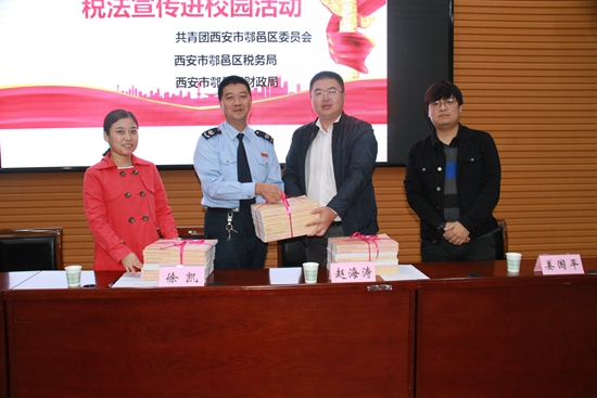 區(qū)稅務(wù)局總經(jīng)濟師徐凱介紹由西安市團委、稅務(wù)局、財政局聯(lián)合發(fā)起的稅收宣傳進校園的活動概括,并宣傳從早抓起,在學生中倡導(dǎo)懂法、知法、守法、學法,鼓勵學生爭做稅收宣傳員。