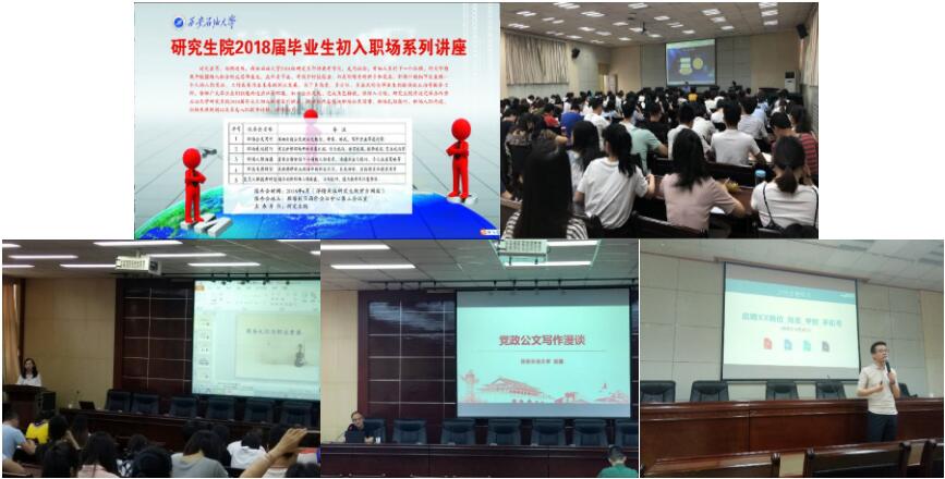 為了更好的幫助2018屆畢業(yè)生走好職業(yè)生涯第一步,研究生院于2018年6月舉辦了第三屆畢業(yè)生“初入職場”系列講座,聘請校內外五位專家分別從職業(yè)生涯規(guī)劃、職場溝通技能與策略、商務禮儀與職業(yè)素養(yǎng)、轉變角色適應職場和黨政公文寫作漫談等角度詳細講解初入職場需要具備的基本技能和注意事項。廣大畢業(yè)生反響熱烈、效果良好。