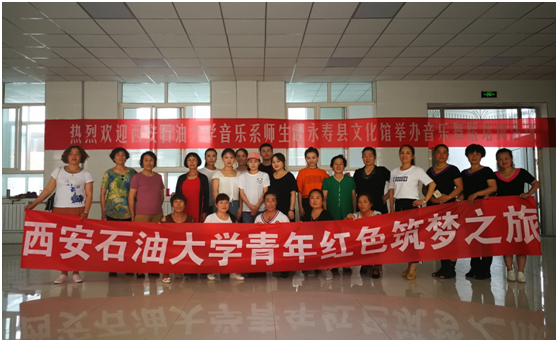 為全面貫徹落實(shí)習(xí)近平總書記回信精神,在校工會(huì)聯(lián)系下音樂系與永壽縣文化館開展結(jié)對(duì)子活動(dòng),引導(dǎo)青年扎根大地,了解國情、民情,助力教育扶貧,實(shí)現(xiàn)文化惠民。6月29日~7月2日為永壽縣文化館開展舞蹈、音樂培訓(xùn)活動(dòng)。何云老師、張萌萌同學(xué)精心準(zhǔn)備了適應(yīng)不同年齡段人群的藏舞、現(xiàn)代舞和拉丁舞;甘璐瑤等同學(xué)為永壽縣聲樂愛好者從呼吸、發(fā)聲、演唱技巧和樂理知識(shí)等方面進(jìn)行指導(dǎo)。本次活動(dòng)有近150名文藝愛好者參與,充分彰顯了我系的專業(yè)優(yōu)勢,提升師生的實(shí)踐能力,發(fā)揮音樂育人的作用,將藝術(shù)實(shí)踐與教育扶貧相結(jié)合,促進(jìn)了永壽縣基層文藝隊(duì)伍建設(shè)。