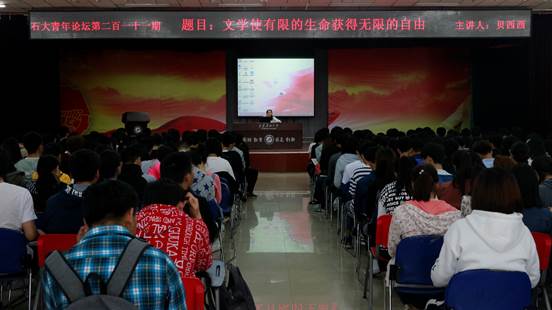 為進(jìn)一步開展好第二屆“書香校園”建設(shè)活動(dòng),由校團(tuán)委主辦,化學(xué)化工學(xué)院承辦的第211期石大青年論壇之“書香校園”建設(shè)主題報(bào)告于2018年4月17日晚19:00在鄠邑校區(qū)騰輝活動(dòng)中心舉行。報(bào)告特邀柳青文學(xué)獎(jiǎng)獲得者、陜西青年作家貝西西主講,學(xué)院黨委副書記劉小波、校團(tuán)委老師周宇、學(xué)院2017級(jí)輔導(dǎo)員楊夢(mèng)琳及390余名同學(xué)聆聽報(bào)告。