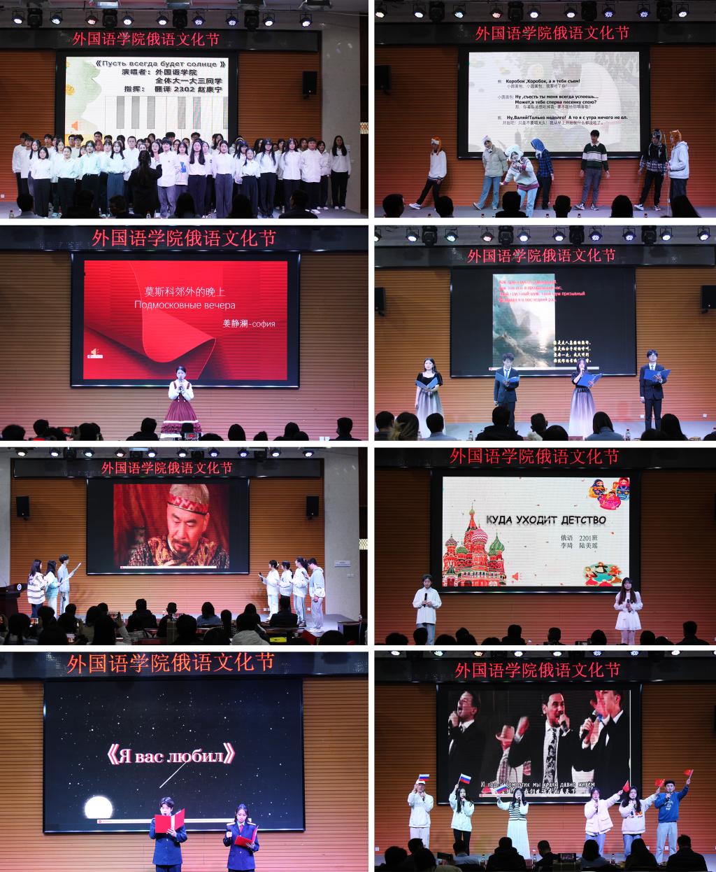 本屆俄語文化節(jié)由俄語歌曲串燒、普希金詩歌朗誦、俄語短劇表演、影視短劇翻譯配音表演以及外語書法大賽等環(huán)節(jié)組成。活動現(xiàn)場熱鬧非凡,節(jié)目題材豐富、精彩紛呈,有機(jī)融合了中國和俄羅斯文化元素。俄語專業(yè)學(xué)生用明快、激昂的大合唱拉開了俄語文化節(jié)的序幕;詩朗誦《致大?!?,讓大家感受到普希金追求光明、謳歌自由的思想情感;話劇《小圓面包》,用可愛豐富的肢體語言和流利的口語表現(xiàn)出學(xué)生良好的俄語語言功底;翻譯配音影視劇片段《甄嬛傳》和《功夫熊貓》將活動氣氛推向高潮;俄語歌曲串燒《幸福鳥》、《莫斯科郊外的晚上》、《致青春》唱出了俄語專業(yè)學(xué)生朝氣蓬勃的精神風(fēng)貌;由西安鐵路職業(yè)技術(shù)學(xué)院的學(xué)生帶來的詩朗誦《我曾經(jīng)愛過你》以及俄語歌曲《小鬧鐘》讓大家眼前一亮;詩朗誦《假如生活欺騙了你》將普希金語言的魅力展露無遺;匯演在俄語專業(yè)2021級學(xué)生帶來的歌舞劇《冬日》中落下帷幕。