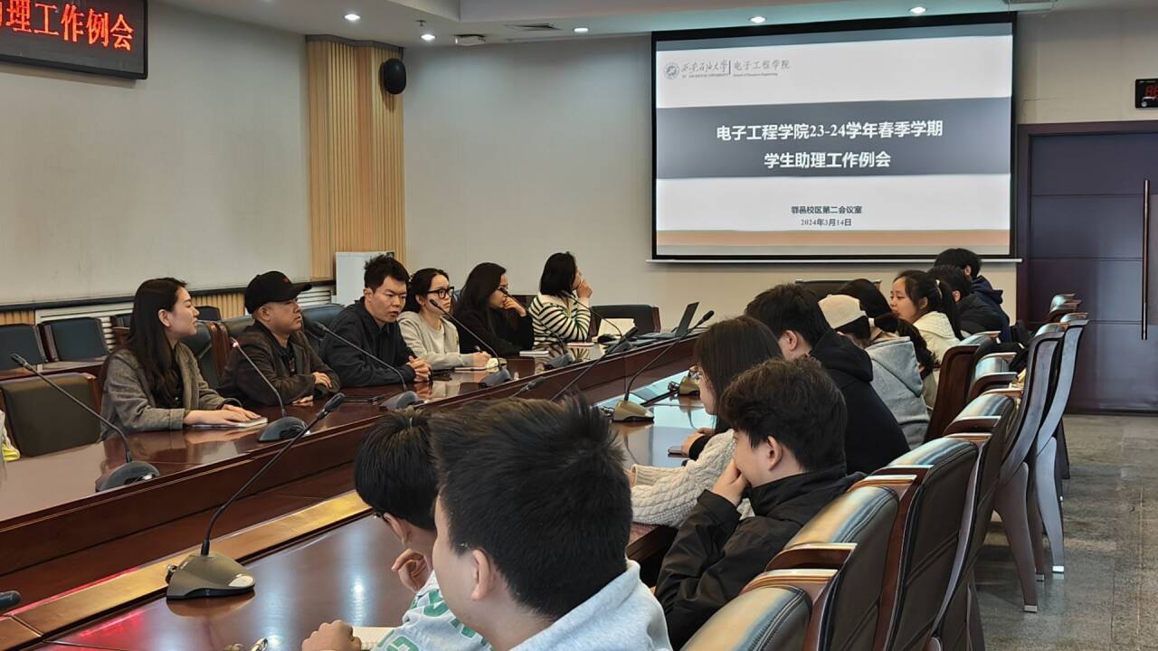 2024年3月14日中午,電子工程學院在鄠邑校區(qū)第二會議室召開23-24學年春季學期學生助理工作例會。會議由沈軒羽主持,學生工作辦公室主任錢宇航和各年級輔導員出席,全院學生助理47人參加本次會議。